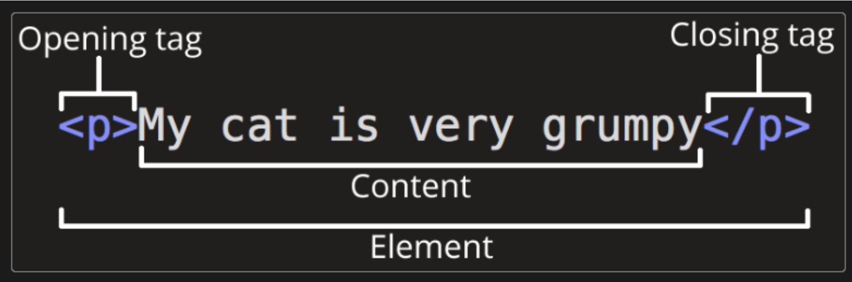 • 요소: 요소는 여는 태그, 닫는 태그 및 태그 사이에 있는 콘텐츠로 구성됩니다.