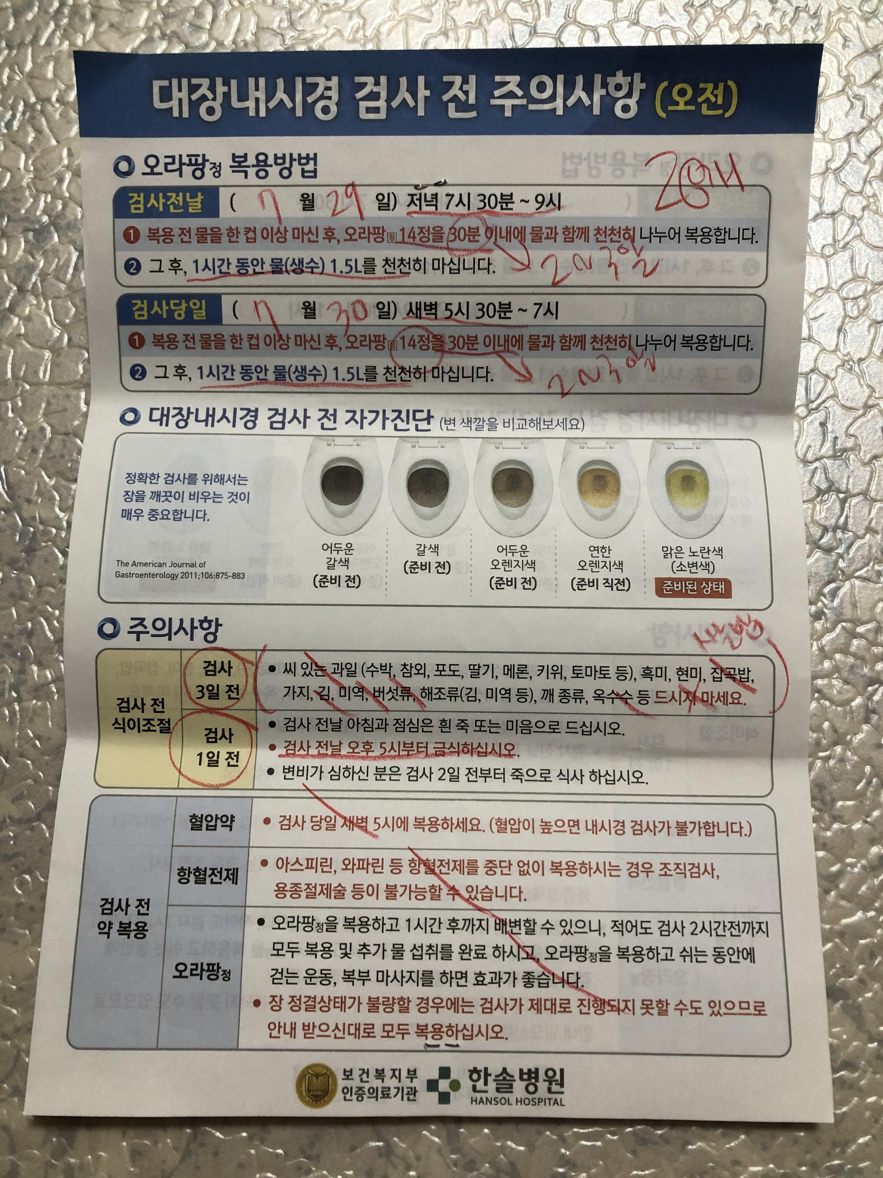 대장내시경 전 식단 주의사항 – 검사 3일 전 식단은 가볍고 자극적이지 않은 음식, 씨가 있는 음식(키위, 딸기, 멜론, 수박 등), 참깨, 곰팡이가 있는 음식을 피해야 합니다. – 검사 2일전에는 흰쌀밥, 달걀, 생선, 두부 등을 드시고 콩, 채소, 해조류(김, 미역, 다시마 등), 김치는 피하세요. – 수능 전날(시험 당일) 수능 전) 죽+간장 or 흰밥+맑은국 or 카스테라 or 케이크+우유 조합으로 드세요. 아침과 점심만 드시고, 오후 4시부터 금식(다음날 아침 검사 기준) 예방 차원에서 검사 전날 생수, 포카리스웨트 등 무색 이온음료를 충분히 드세요. 단, 대장내시경 2시간 전 물과 이온음료는 금합니다. * 대장내시경 전 음식물 장내 청결을 위해 검사 3일전은 백미와 백미단백만 드시고 검사 전날은 백미만 드십시오(검사시 대장이 맑고 깨끗함) 방법 대장내시경용 약(wanlaifang) 복용 대장내시경용 약은 액체(Culprep acid, Ledipris acid, Cullite acid 등) 및 알약(Olapang, Cricolone 등)을 포함하는 세척제입니다. 가장 일반적으로 사용되는 드롭은 컬프렙산(8팩)이고 알약은 오라팡(28정)입니다. 가루를 물과 섞어 약으로 만들기 때문에 위가 약한 사람은 토할 수 있다. 알약 형태의 오라팡 대장내시경 약물이 이를 보완할 수 있습니다.